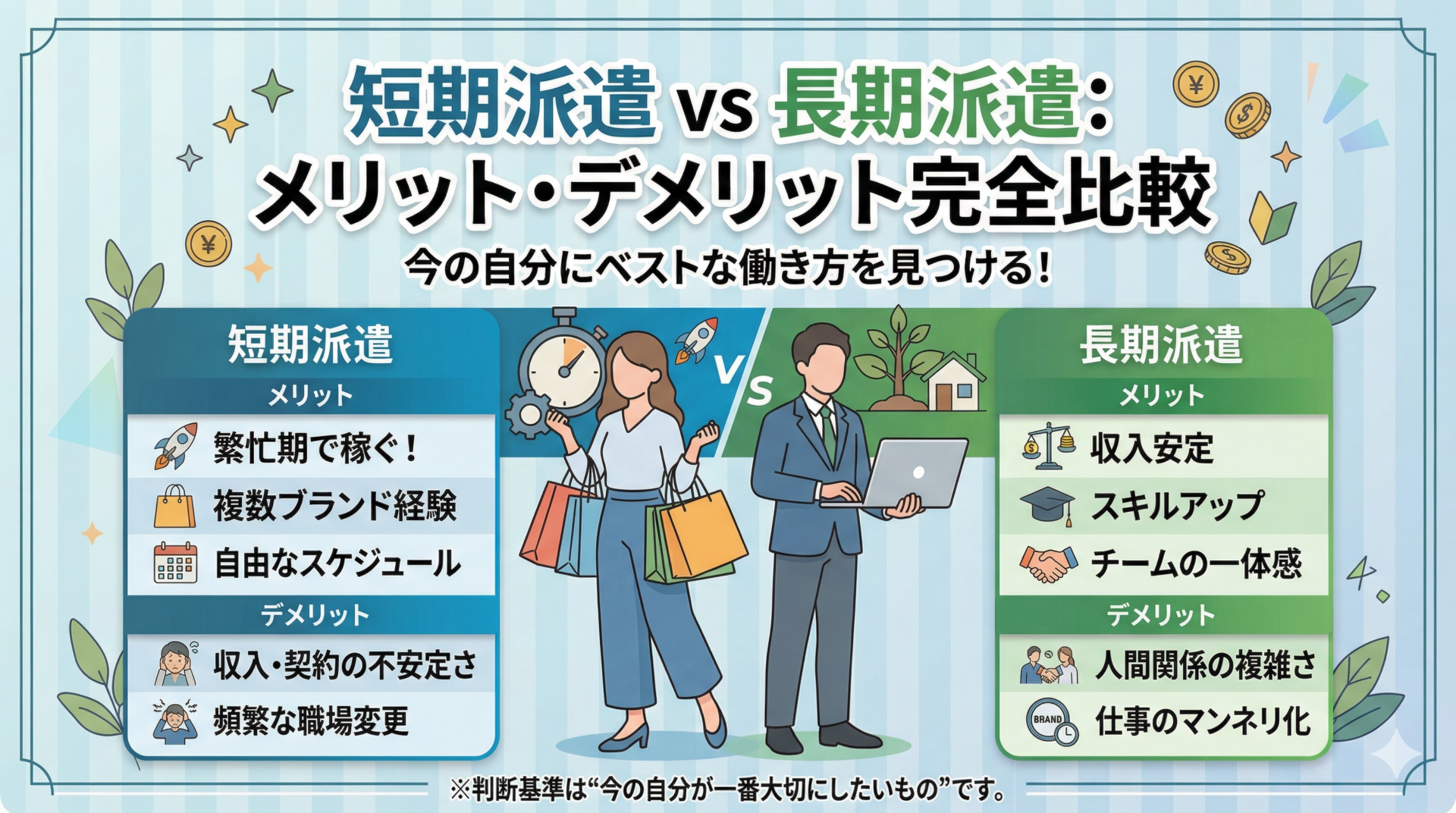 短期派遣は刺激的で収入を引き上げやすく、長期派遣は安定と成長の両立がしやすい。